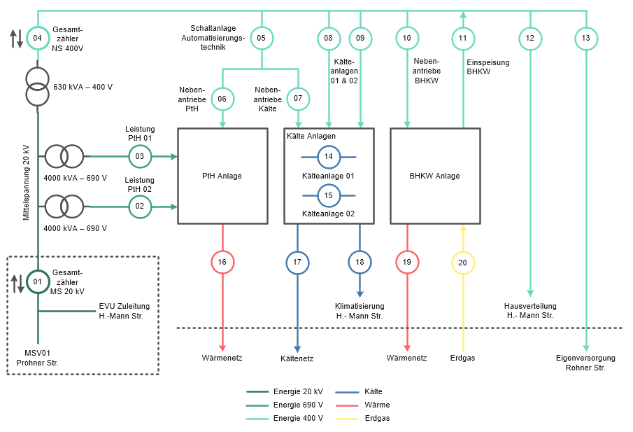 Die Power-to-Heat-Anlage wandelt volatile, überschüssige Elektroenergie in Wärmeenergie um. Mit dem neuen BHKW wird die Energieversorgung zweier Heizhäuser sichergestellt. Besondere Aufmerksamkeit bei der Planung galt der Verteilung der alten und neuen Energieerzeugung.
